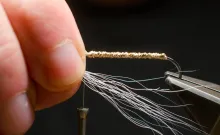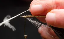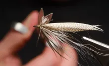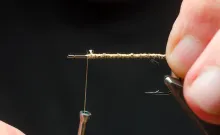 The body can, as already mentioned, be tied in gold or a suitable color like cream or orange. The original prescribed oval gold tinsel wrapped for the body, but I have used a braided gold yarn, which is easier to handle – and much less expensive.