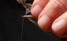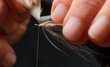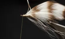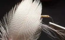 The wing is supposed to lie quite flat over the body, and this is obtained by making sure the thread foundation isn't too tapered, but more cylindrical. Lay down a full feather on top of the hook shank and catch it with a couple of semi-loose thread wraps. Pull the stem to adjust the position and "gather" the feather to a narrow wing and then secure it with a couple of tight wraps.