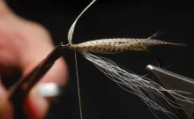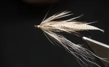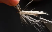 The hackle is grizzly and has to be quite long fibered, preferably about half the shank length although less can do. But it's a good fly to use some of those oversize feathers often left on necks and saddles after the "good" feathers have been used.