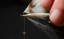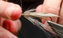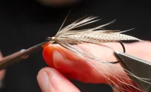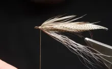 The throat or belly is hand stacked gray bucktail, tied it in so that it reaches well beyond the hook point. Make it sparse. We're talking 12-15-20 hairs tied in so that they don't flare too much.