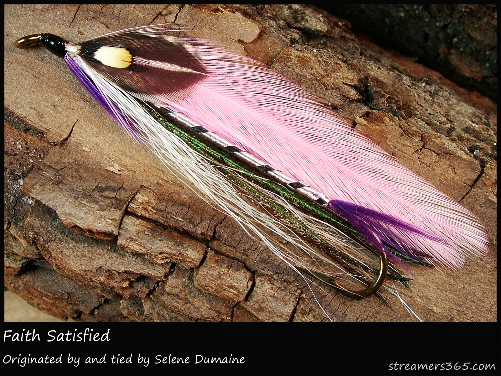 Faith Satisfied - Selene Dumaine Tied by: Selene Dumaine Originated by: Selene Dumaine Hook: Mustad 94720 Thread: Black 8/0 Tag: Silver flat tinsel...