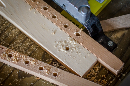 The vertical colums get one hole for the boom, and the boom gets a few extra holes to allow adjustments. I just guessed here - it's not rocket science.