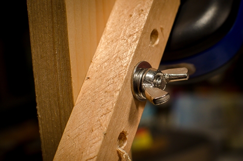 Along with the lights, I wanted an adjustable way to hold them above the fly, so they could be moved around to suit the needs of the situation. Using some scrap woods and a few bits of hardware bought from Lowes, I came up with what is basically a boom arm support for the lights.