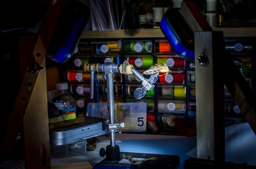A simple three light setup using cheap LED lights with parchment paper diffusers and homemade wooden boom stands. They will not win any beauty contests, but they are functional, easy to use, and readily available at my tying desk.