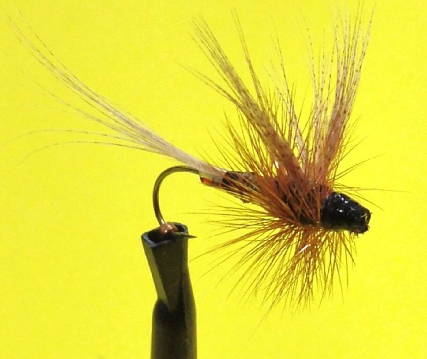 This is a "Catskill Tube Fly". It measures 5/8" front to back. It is built on HMH Micro tubing. Instead of using hook tubing to fasten the size 12 dry fly hook, I prefer to heat the tip of a scratch awl and widen the tubing so that the hook seats inside the micro tubing. This gives a more sleek design without the bulky hook tubing. The nose of the fly gives the sleek appearance that the Catskill fly is noted for.