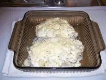 Stack the sauce mixture on the fish, place in the preheated oven (uncovered) and cook for about 30 minutes (after about 20 to 30 minutes check that the fish is getting close to getting done by seeing that the fish will flake away). If you are satisfied with the doneness of the fish sprinkle the parmesan cheese over the mixture, return to the over for about 10 minutes or until the cheese is melted. Remove from oven and let sit for 5 minutes, if the sauce is a bit soupy it will thicken quickly.