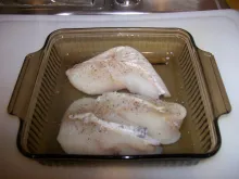 Place the halibut steaks in a glass ovenproof dish, salt and pepper the fish (sea salt works best, Mediterranean salt if you have it, for pepper I prefer Tellicherry pepper which is a bold Indian pepper)
