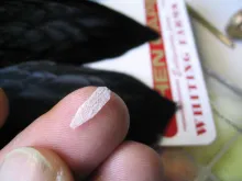4. Take a hen hackle, stroke the fibers back, and clip the tip off. The little triangle of fibers makes it easy to tie the hen hackle in.