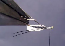 A while ago I read Steve Schweitzer's article on a great fly of his, the PeeMew Midge. It uses thin, semi-translucent foam for a wing, and when wet the foam becomes even more realistic as a wing. This foam is the type of foam used as packaging material for stereo or computer equipment. It comes in sheets, is white, and about 1 mm thick. The result looks perfect. This fly uses the same type of foam as wing material, so: thank you Steve!
