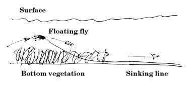 One of my favorite ways is to use a deep sink line and use a dry, well doped muddler on a leader of varying length depending on the conditions - A sort of fly fishing carolina rig, if you will. It's the best sunk-fly approach to use in heavy hydrilla. Leader length is dependent on the height of the subsurface vegetation. You want the muddler to swim just above the vegetation.