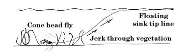 Another way to achieve this is to use a heavy cone head (the cheaper approach is to use bass worm weight-these can be purchased in various sizes) and try to bust through vegetation to reach the fish-A fly fishing version of flipping. It's definitely not fly fishing by any stretch of Halford's imagination, but it may produce that fish you will think about for a long while. Use a short line and let the rod send the lure to its destination. Fish the muddler with and up and down motion. Marabou in the construction of a muddler used in this manner is highly recommended. Use a stout rod-at least an 8 wt but preferably heavier-and a short tip sink line.