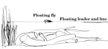 There is, of course, the dead drift dry approach. I use this in mid-day when bass are holed up in the pockets in the maidencane feasting on damsel and dragonfly nymphs and adults. Usually the water is 90 degrees and the fish are holed up in the shaded holes in the edges of the lakes, among the maidencane or pads. I use a dopped up muddler with a floating line and a ginked up leader. I cast it in a suspected lie and let it lie for as long as the fish can stand it. BTW, I have some adult damselfly patterns that are modified muddlers that I use in this context. The muddlers sport a deer hair collar, usually green or blue, wings are not flat but on edge to simulate the wings of a damsel at rest and the body is made of deer hair or bucktail tied in an extended style. Make sure that the abdomen where the hook and extension meet is well reinforced since that area will get hammered quickly.