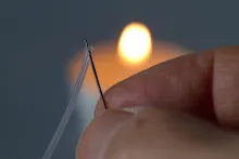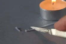 Cut off two pieces of inner tube approximately 1 centimeters long (can be both shorter and longer). Melt one end on both of these pieces. Heat a needle and melt a hole into the tube at an angle of approximately 30 degrees.