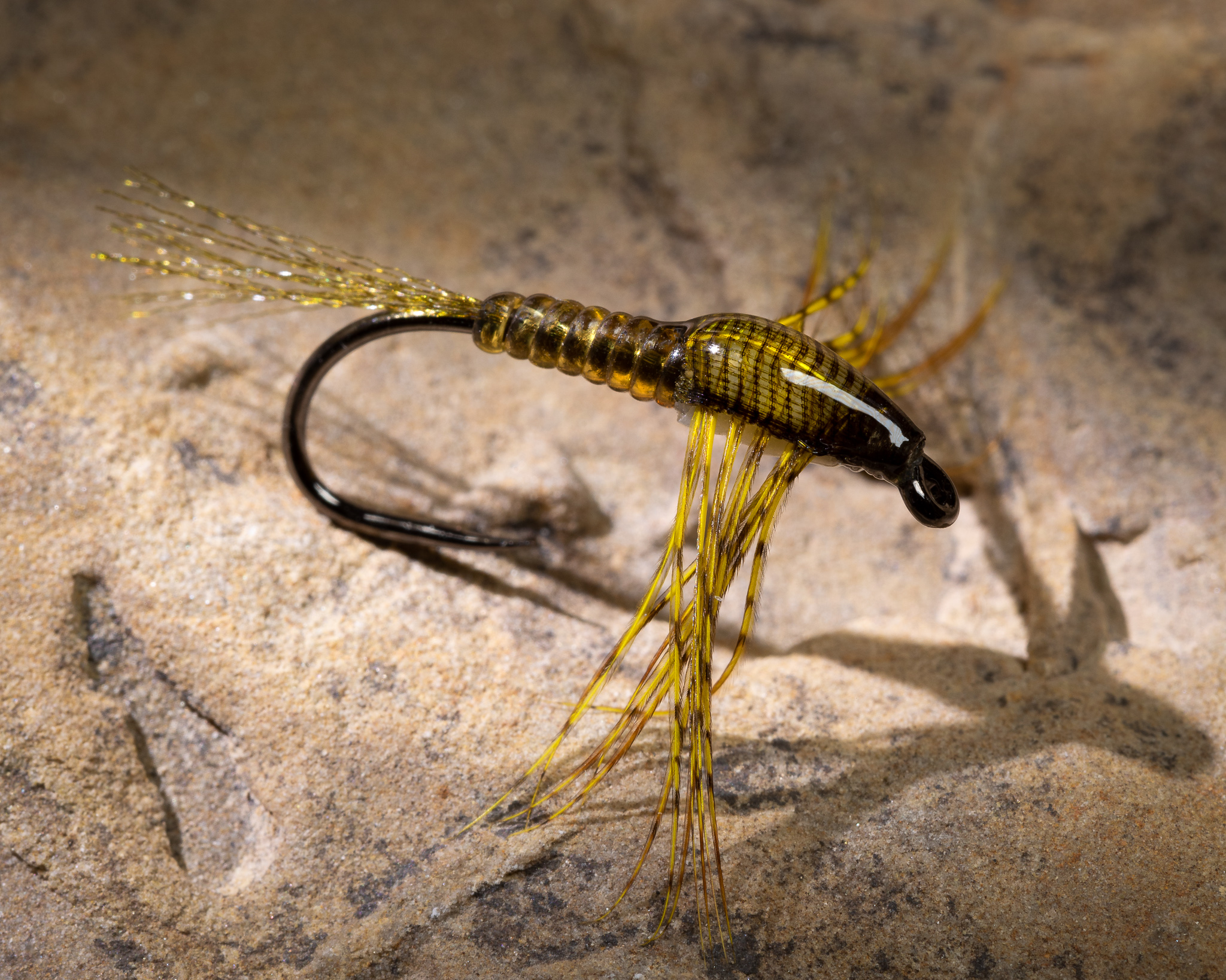 - Stretch and wind the body glass in touching turns easing off the tension as you wrap to produce a tapered abdomen. Tie in and trim off the waste end.