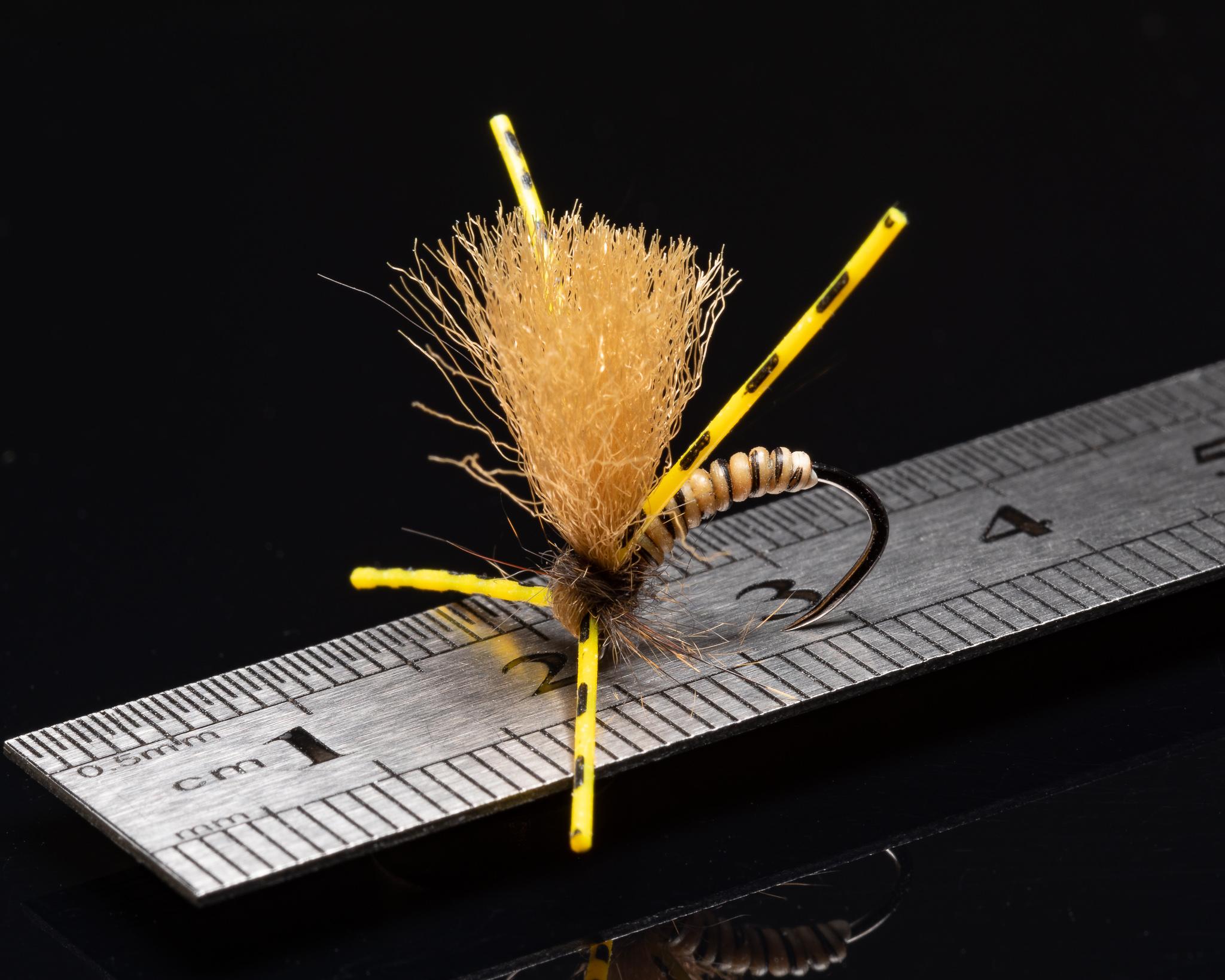 - Tie in a yellow leg strand on either side of the hook a little way back from the eye.
