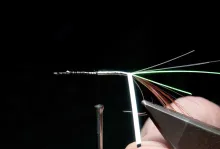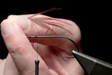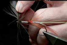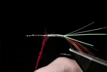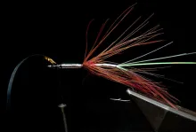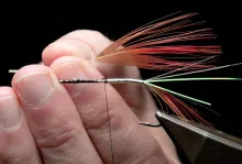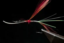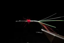 The Djihad is a bright fly with a shiny body, silver combined with black and red. Just my kind of fly. I like the Irish Shrimp tradition flies, and this is such a fly on steroids. It even uses one of my favorite materials: Golden Pheasant.