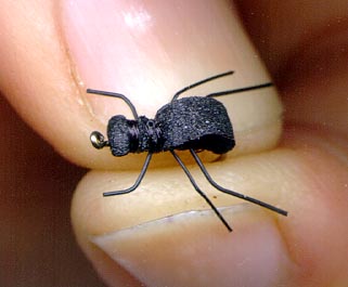 The materials for the ant are few and simple - and all synthetic. For the body we use foam of the closed cell craft foam type and the legs and antennae are single, synthetic bristles from a broom or paint brush. A few years back I cut a piece of a new, small broom... much to the regret of my wife. But it supplied enough leg material for lifetime worth of ants and beetles.