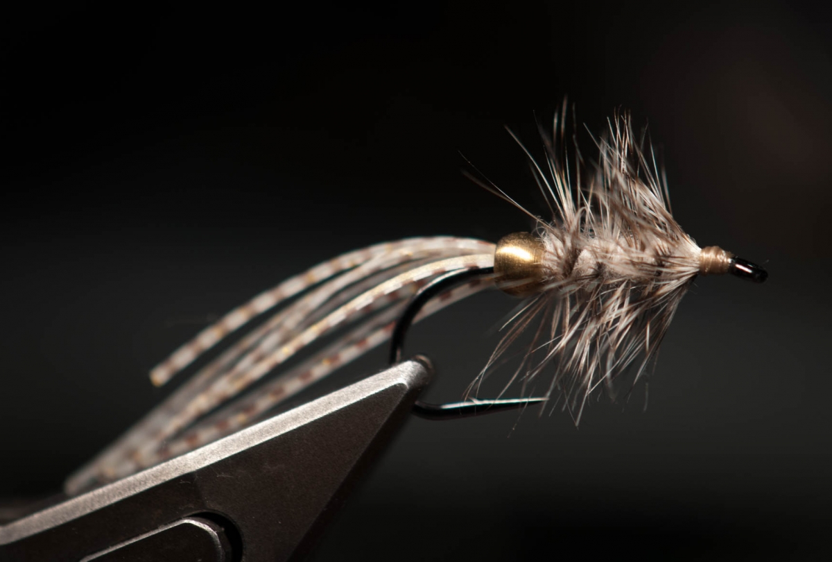 The first versions of the fly I tied on a size 4 hook using a brass bead, tan/gold rubber legs and some tan dubbing. I found the first and simplest versions a little skinny, and decided to add a hackle to the front part of the fly, and this addition made it look very much like a small squid, the shiny brass bead easily standing in for eyes and the hackle imitating the mantle and fins.