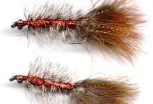 The red head version of the fly takes the colored front one step further, adding red or orange dubbing as a replacement for the marabou dubbing on the original. The fly is tied with a significantly longer hackle than the original, but most dominant is the large and fluffy orange or red head made with wool or some other natural fiber in a dubbing loop over the eyes. The fly is recommended for autumn and cold water fishing.
