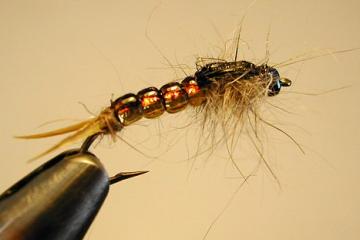 TYING TIP Crowd the beadhead with dubbing so the turkey tail top has a more wide-diameter place to rest once it is tied in. This will widen the top of the carapice the turkey tail is representing.