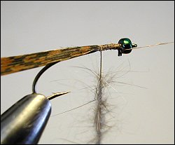 Tie in two golden goose biots at the edge of the last bead. Prepare a fine bit of dubbing (as shown in the picture) to wrap over the biots and hold everything in place. Tie off and place a drop of thin tying cement at the tail and at the head.