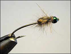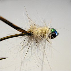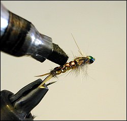 Using hare's ear or hare's mask dubbing, dub a rather thick abdomen section, ensuring the guard hair fibers are sticking out, looking downright ugly. Brush the fibers with a toothbrush or dubbing teaser to get all the fibers outward.