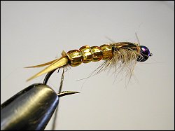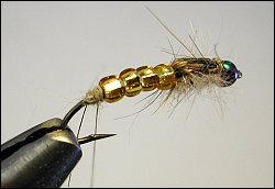 On Western streams and rivers, fishing a golden stone pattern as a searching nymph can yield surprising results when no other pattern will seem to work. This little pattern will sink just like a beadhead and will imitate the colors a golden stone nymph has, almost to perfection. Follow the tying sequences below to make your own!