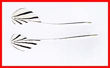 - Saddle the cheeks with the strips by pinching the strips over the hook shank and tightning the thread down over the wings. The wings should be long enough to reach a point above the hook bend
