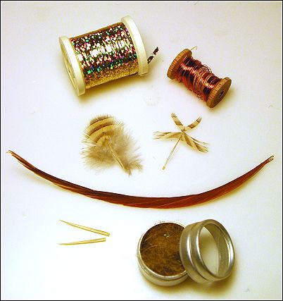 In addition to a hook and a bead for the head, the materials are simple: fine copper wire, some sort of small brown feather (a partridge feather is shown stripped and prepared for tying to the middle-right), holographic mylar, golden goose biot, and some rabbit or squirrel fur dubbing.