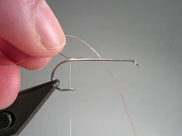 Attach the thread over the hook bend and tie in a long piece of ribbing material