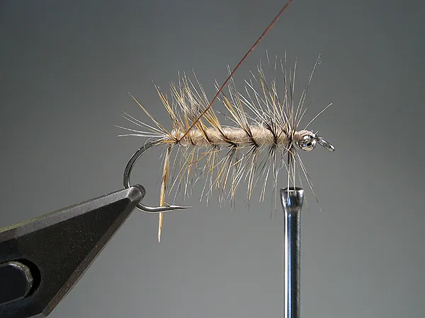 Catch the hackle tip with the copper wire and start winding the ribbing in the opposite direction over the hackle.