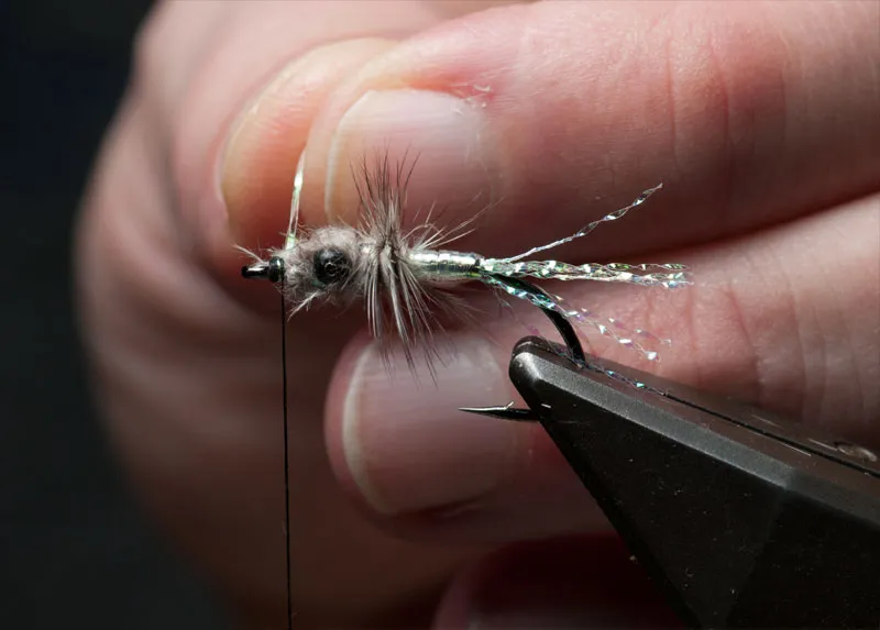 Secure the hackle with the flash rib and take this forward to the hook eye and several times aroung the hook shank right behind the eye
