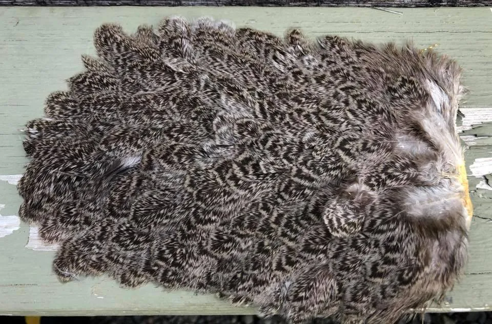 The mottled Brahma hen is an alternative to grizzly for hackle.