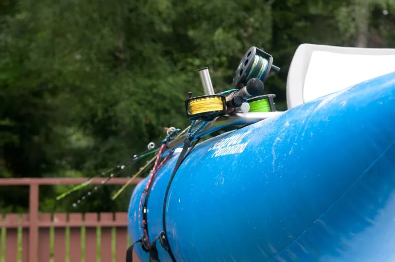 The rods are simply tied down with the bungees holding the pontoon boat on the roof of the car