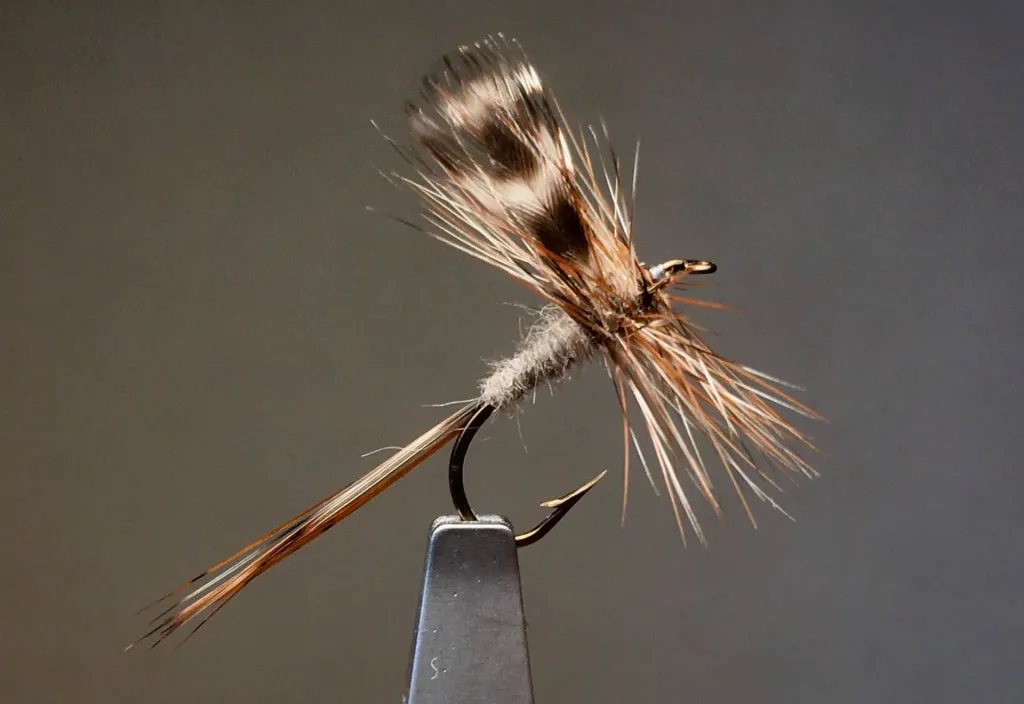 An Adams with grizzly wings and hackle. Jay writes: "Adams with wings from a vintage Darbee grizzly hen cape giving the wings a more broader & rounder profile. Vintage Mustad 94840 size 12, musk rat dubbing, grizzly Collins & Dark Ginger Sideling Hill Hackle cape."