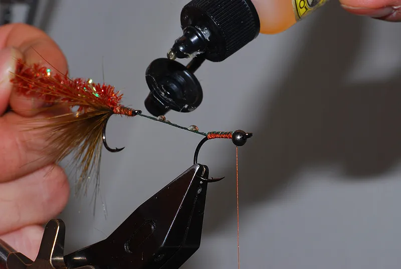 superglue becomes stiff, so I am using AquaSeal og other flexible-when-dry-glue. Here I am using a Loon knot glue.