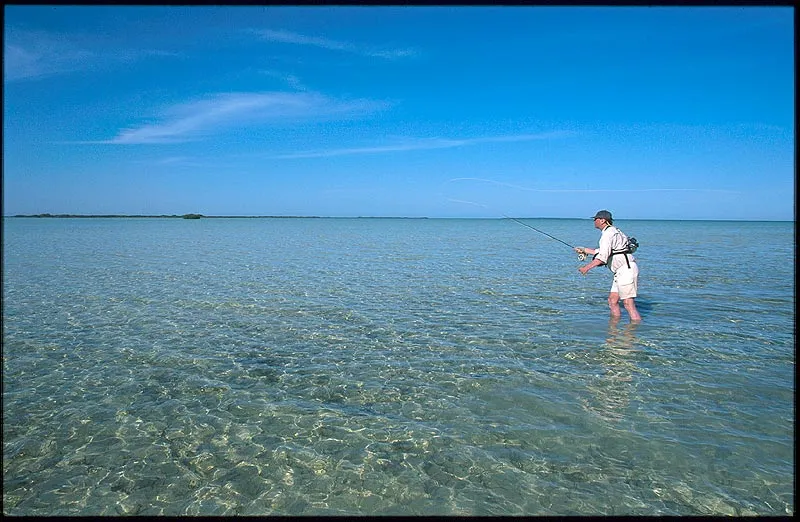 Kim on a typical flat under great conditions. The water is slightly riffled, but clear, the sky is blue and the sun aides greatly in spotting the fish in the shallow water. The flat stretches almost as far as the eye can see.
