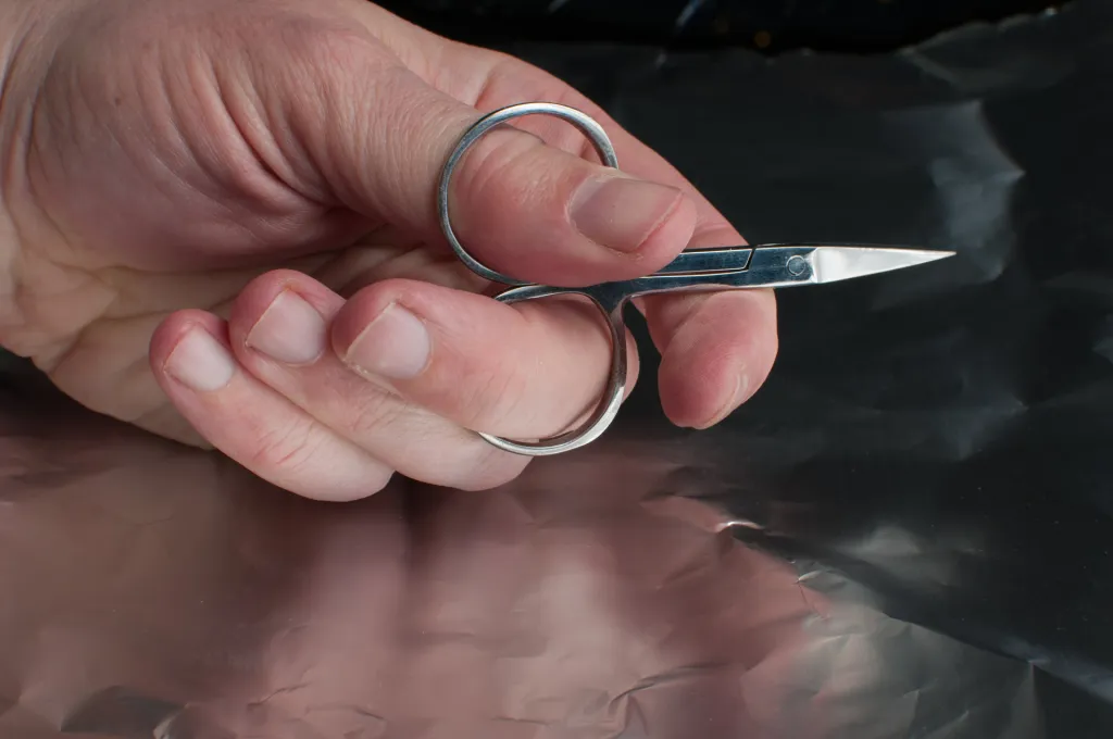 These compact Pakistani scissors have a short reach when held on the middle finger