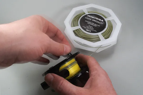 Put the fly line spool on something that enables it to turn and start winding the line onto the reel. Do not wind the line off the edge of the spool. That will induce a lot of twisting into the line, which you must avoid by all means.