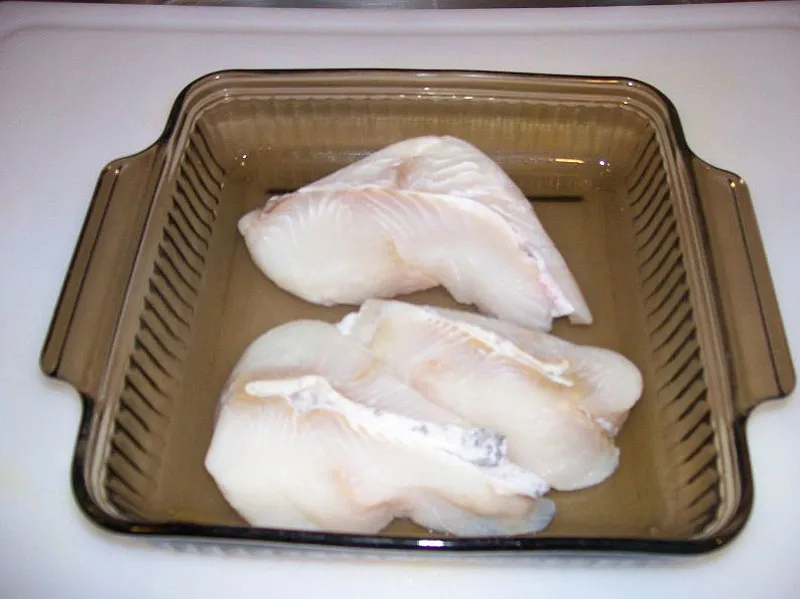 Halibut in the dish, oil the dish slightly with cooking oil to prevent sticking (I use olive oil but any oil works just fine).