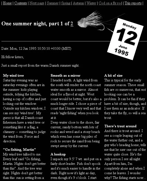 One of the real oldies from GFF, originally mailed off to the FF@ mailing list and since converted to an article on Fishing Denmark. The page is still here, even though the design has changed to adhere to the current style.