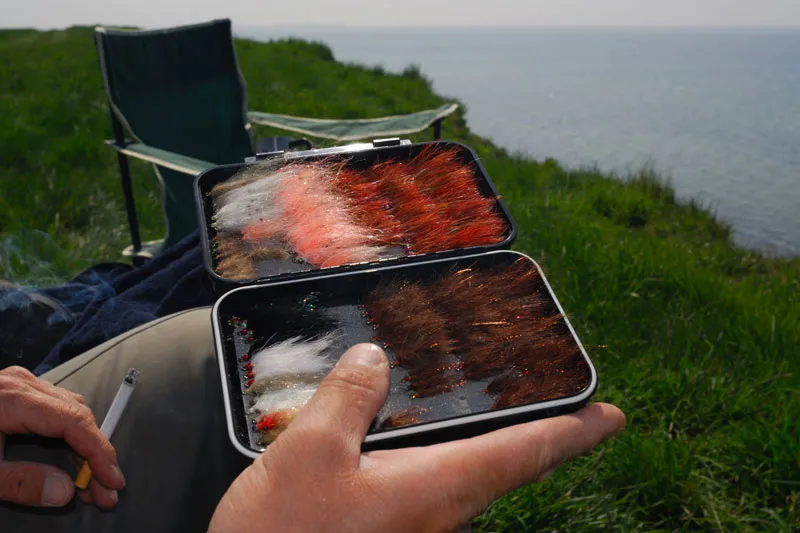 One of Ken's fly boxes. Mostly Charlies, Mini Pigs and Omoe Brushes. But look under his thumb... yes, a couple of elusive Cutelings