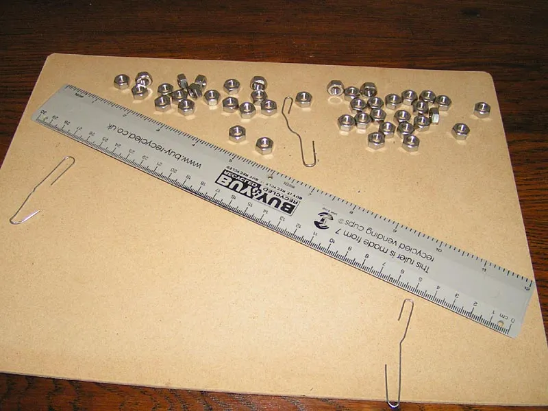 Ruler with holes drilled. Clips straightened. Nuts weighed.