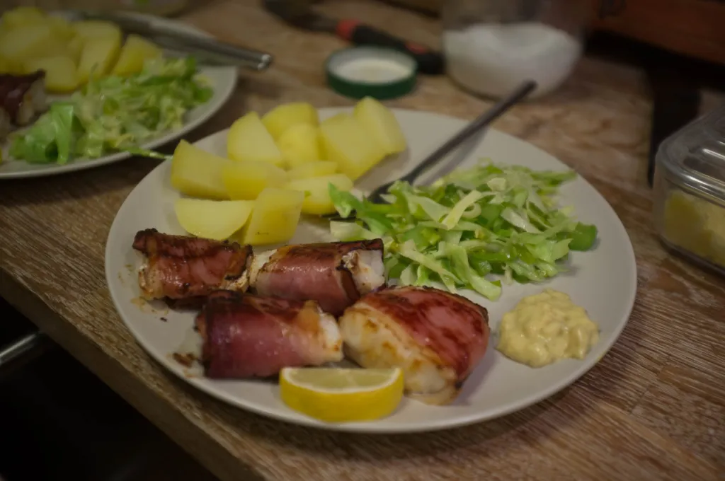 Fish in dried ham, veggies and potatoes - and a bit of lemon and some sauce remoulade