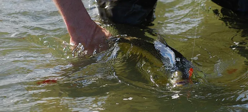 A sea trout with an orange Christmas Tree in its mouth gets grabbed by the tail