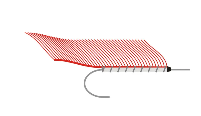 The rib ties down the strip in full length and is caught by the thread in front. The wing is done