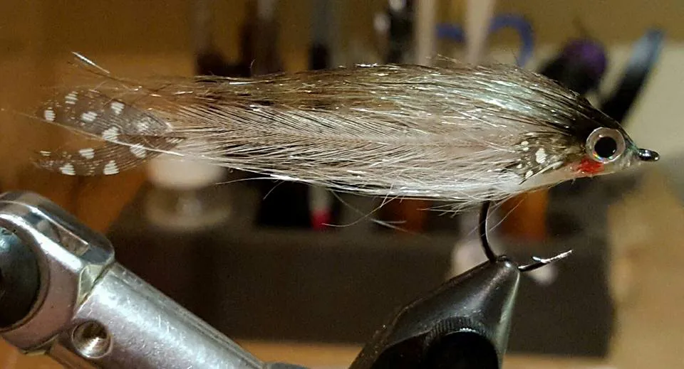 On this fly the body is a Guinea Fowl feather flanked by a couple of hackle feathers