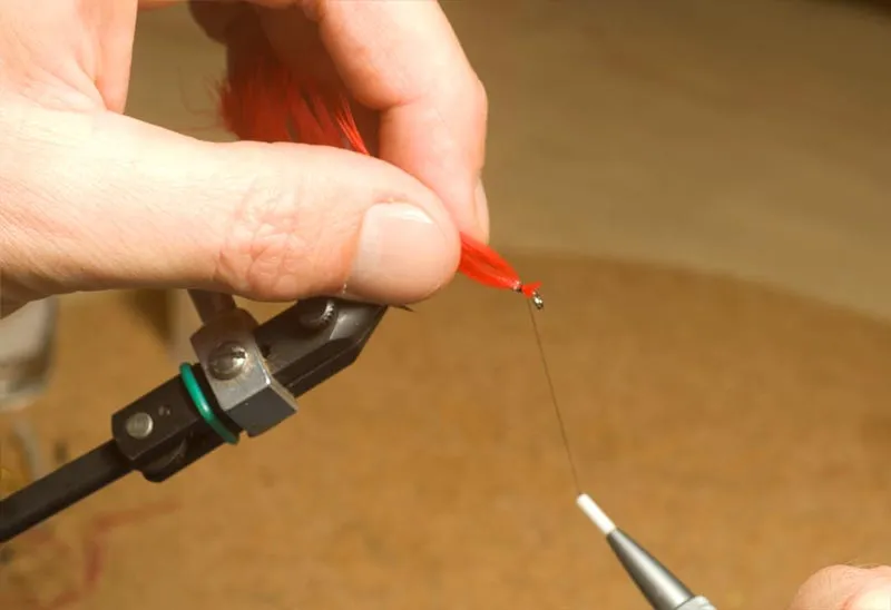 Tie in the feather, tip first and shiny side forward