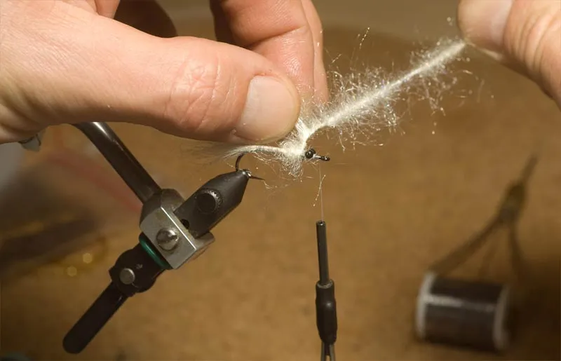 Start wrapping the dubbing rope forward in tight turns. Pull the loose fibers back while doing so