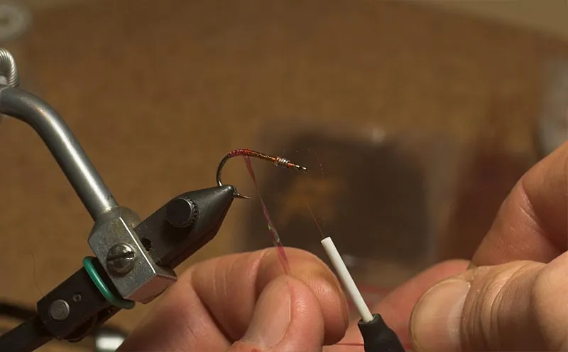 Wind the flash over the still wet nail polish to form a fairly long tag - 1/3 of the hook shank in lenght
